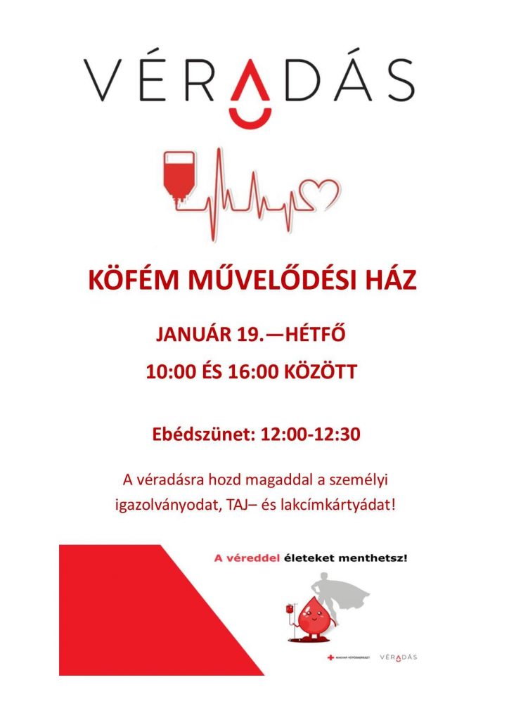 A Magyar Vöröskereszt véradást szervez a Köfém Művelődési Házban 2026. január 19-én, hétfőn, 10:00-16:00-ig. (ebédszünet 12:00-12:30). A véradáshoz hozd magaddal a személyi igazolványodat, TAJ- és lakcímkártyádat. Adományozz egészséget.Aki vért ad, életet ad!A véreddel életeket menthetsz!